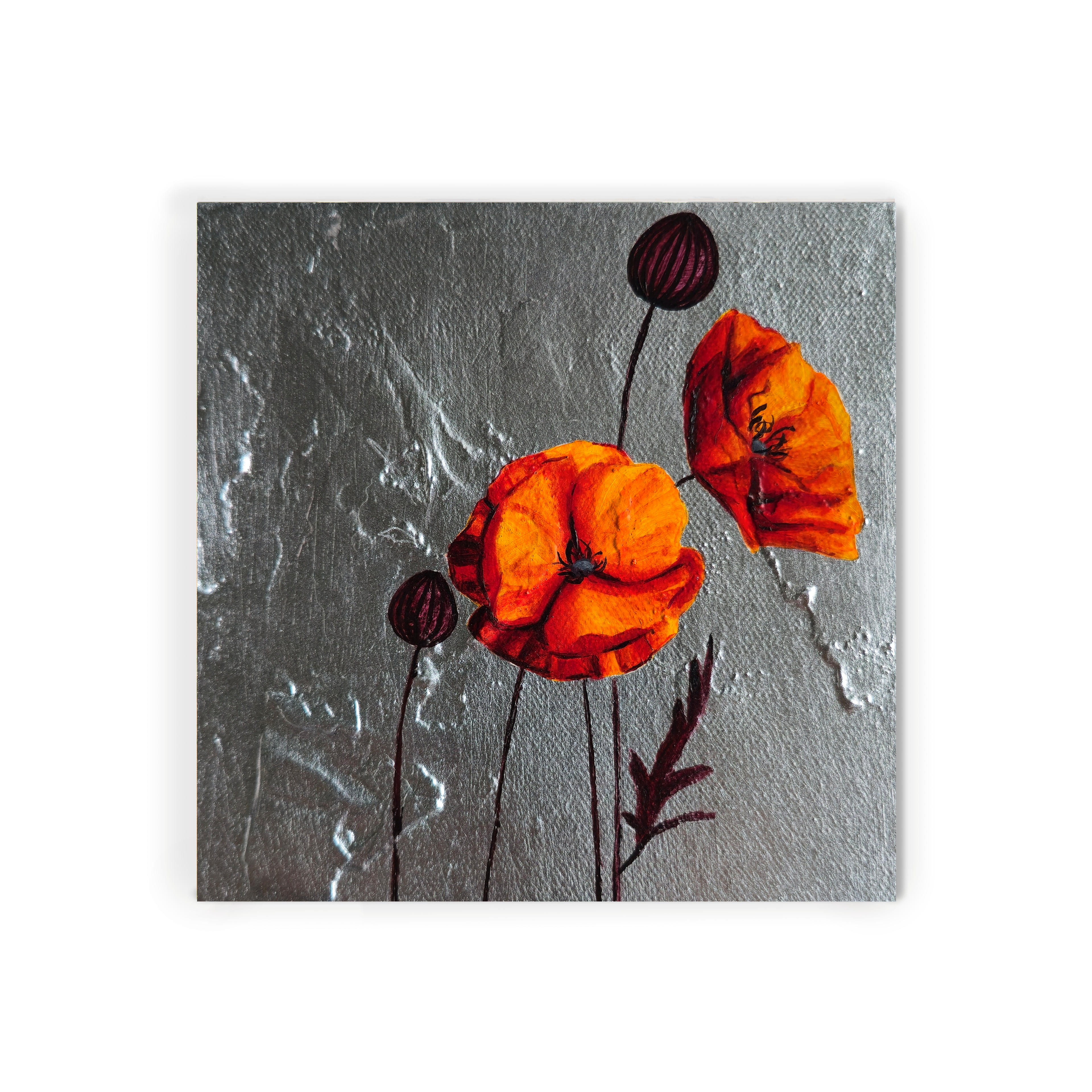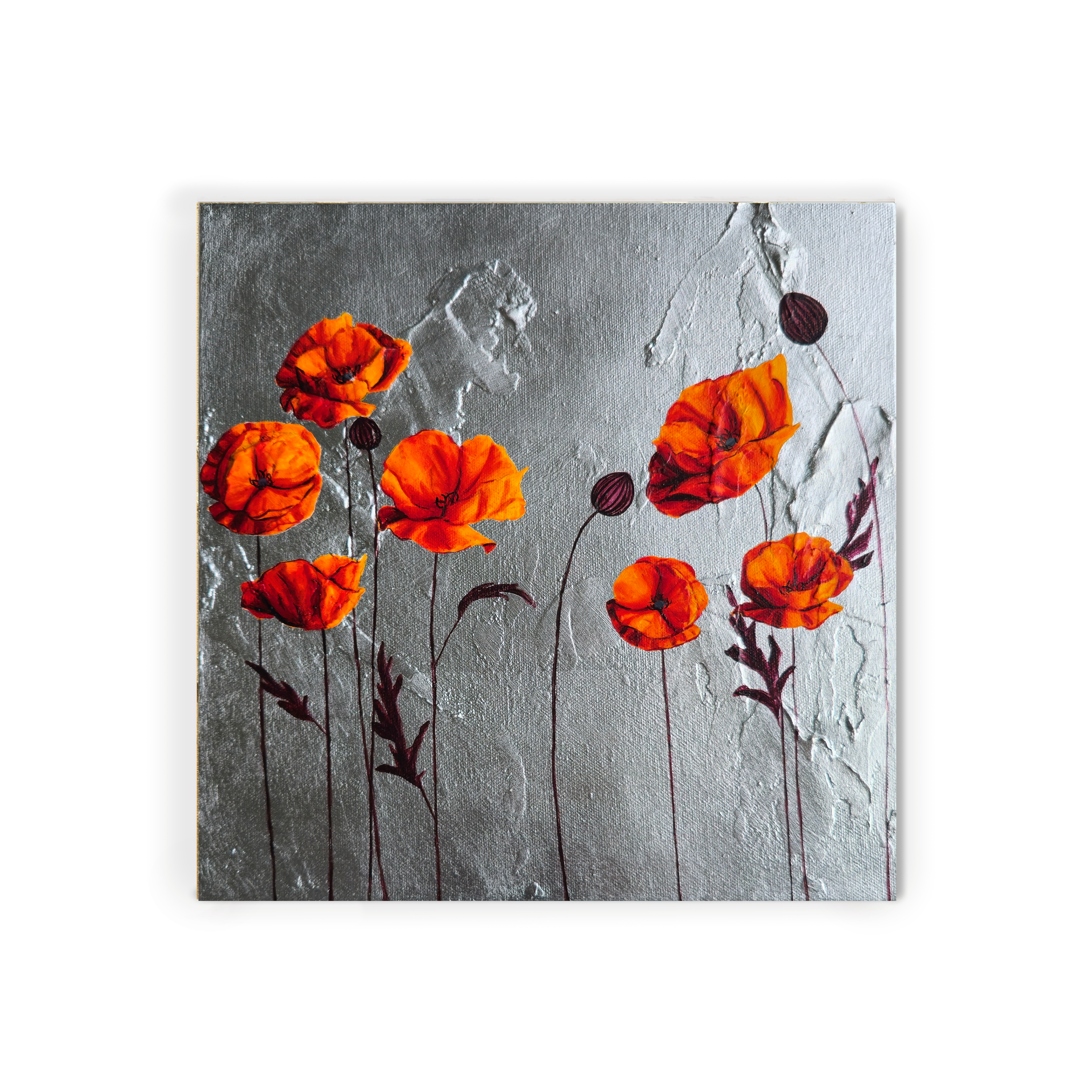 12 x 12ORIGINAL AVAILABLE$485 eachPoppies come in hues of red, orange, yellow, white, pink, purple and even blue. So why limit poppies to a single garment?This collection was my first time experimenting with orange, let alone orange poppies. To get something both vibrant and somber with orange was a journey. Orange has so much joy in it, it was tricky convincing it attend to the seriousness of the occasion.But here she is, brilliant in orange against a backdrop of dripping silver.