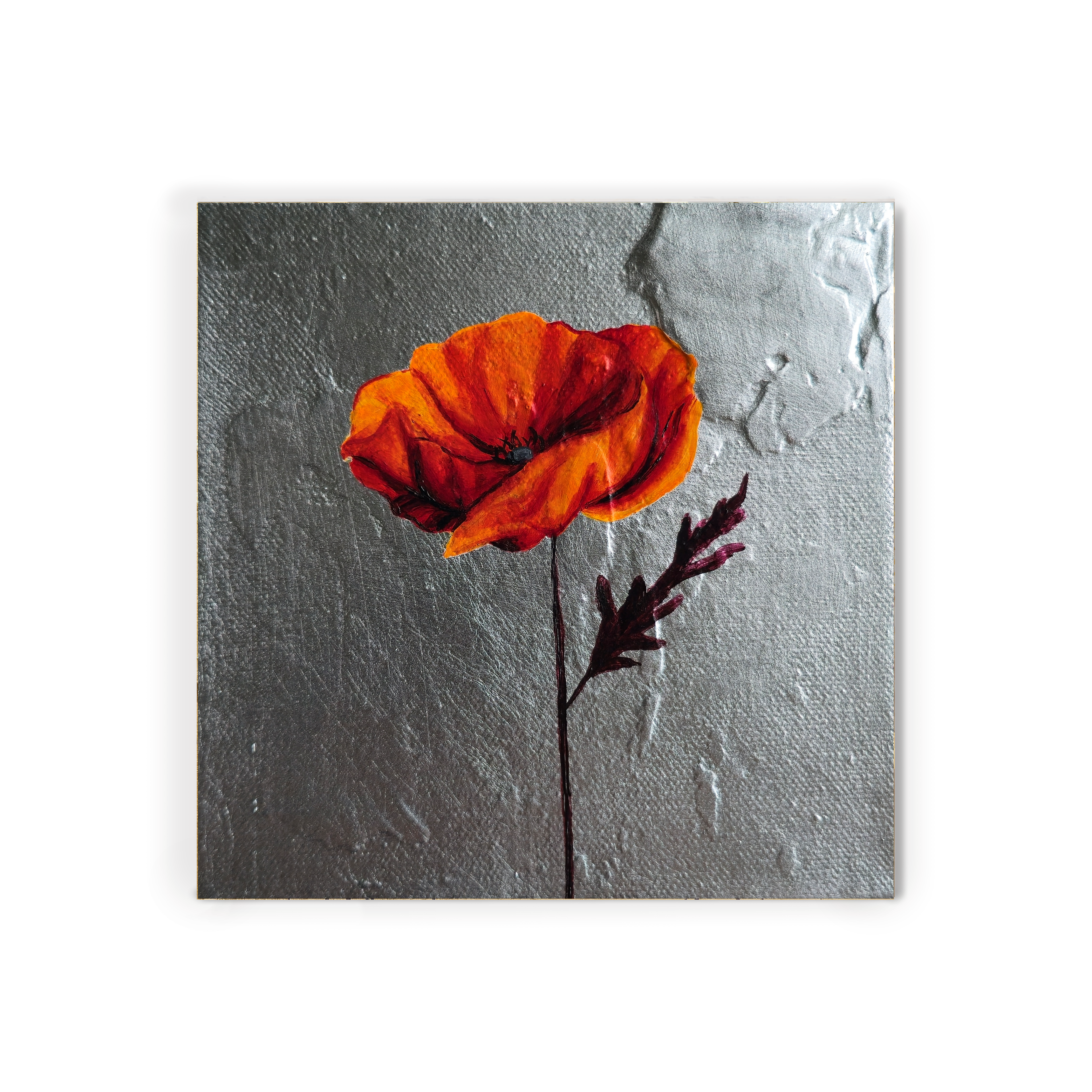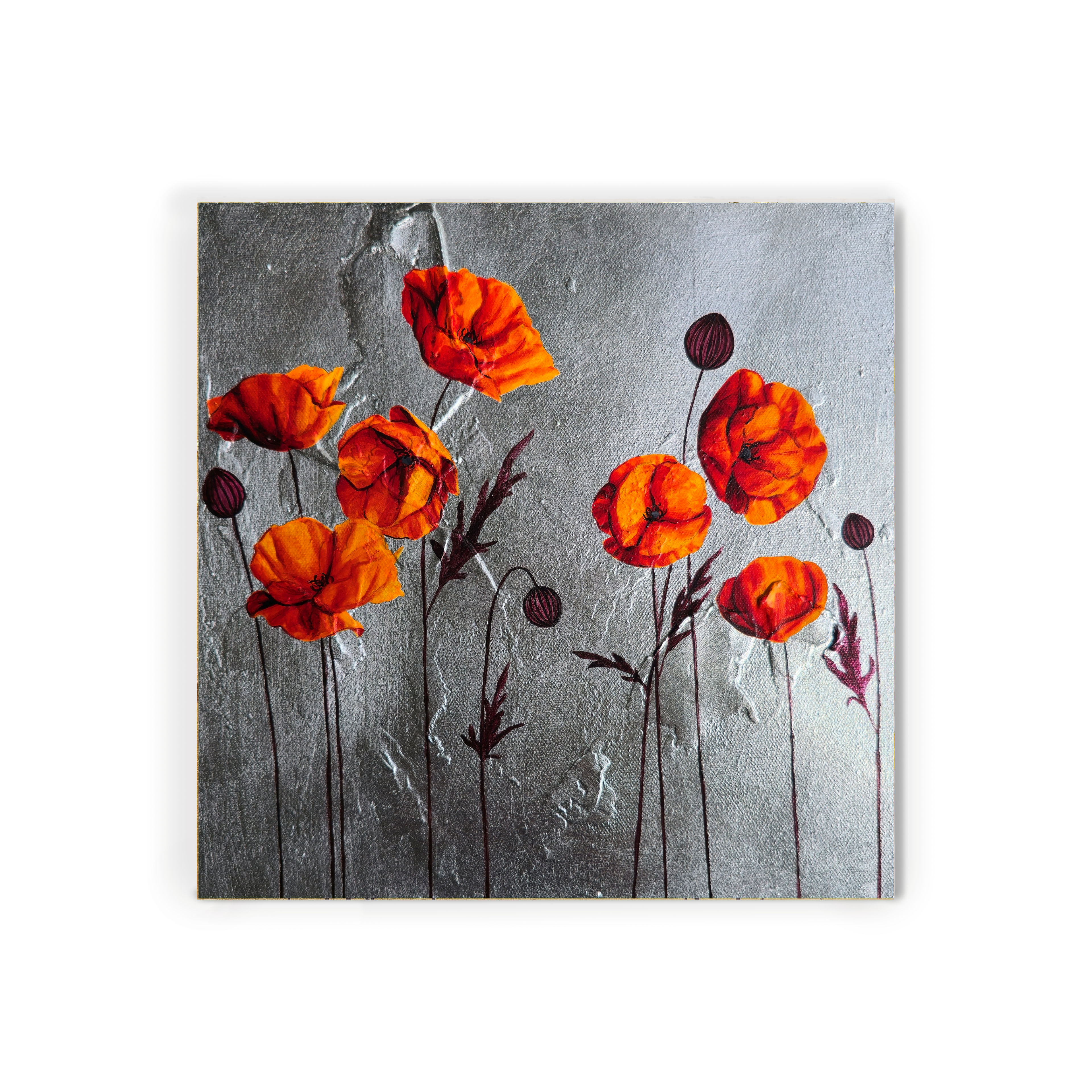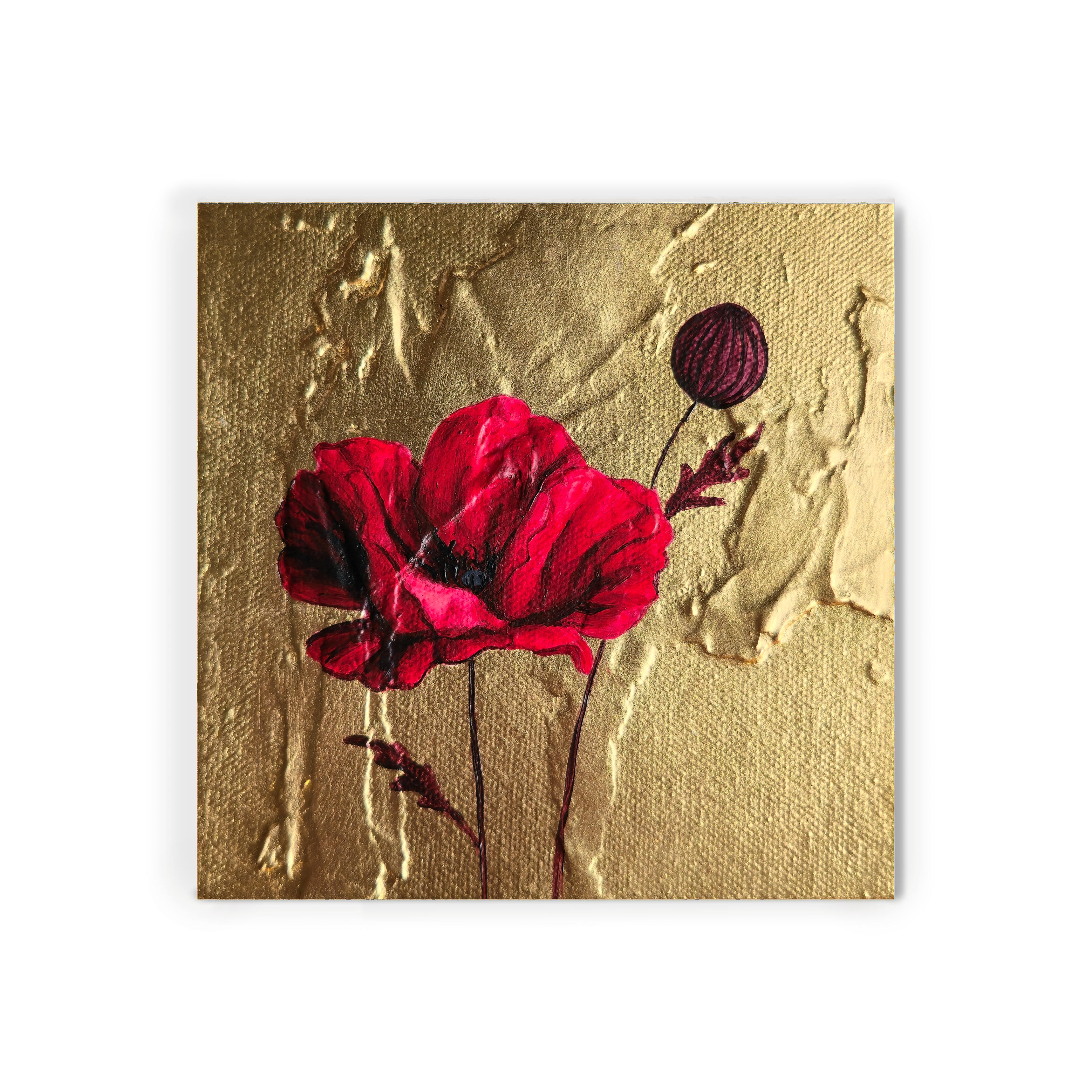 12 x 12ORIGINAL AVAILABLE$485 eachWhen you hold a poppy, she is heavy. She holds more in her butterfly petals than their light and fluttering breathing. She is memory and meaning. Her hue of crimson is a dart, her spine is straight and her eyes hold yours in a direct knowing stare. You do not love a poppy just for her beauty. You love her knowing she is something more.