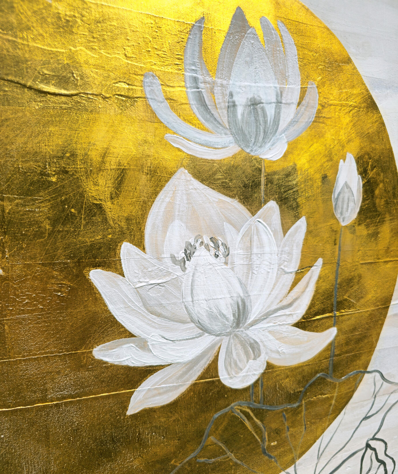40 x 30ORIGINAL AVAILABLEAcrylic, 24k Gold$2800Lotus flowers have long symbolized purity, enlightenment, divine beauty and grace. They grow in muddy or murky waters but remain unblemished. The pure white flowers remain pristine and untainted despite their surroundings, carrying themselves apart with quiet dignity and grace.In the foreground, the delicate silhouettes of three lotus flowers stand in gentle contrast against the radiant golden sun. Their graceful curves and intricate details are rendered in shades of white and silver, adding a sense of ethereal beauty. It is meant to invoke the sense of tranquil ponds and calm waters and grant you a sense of peace.