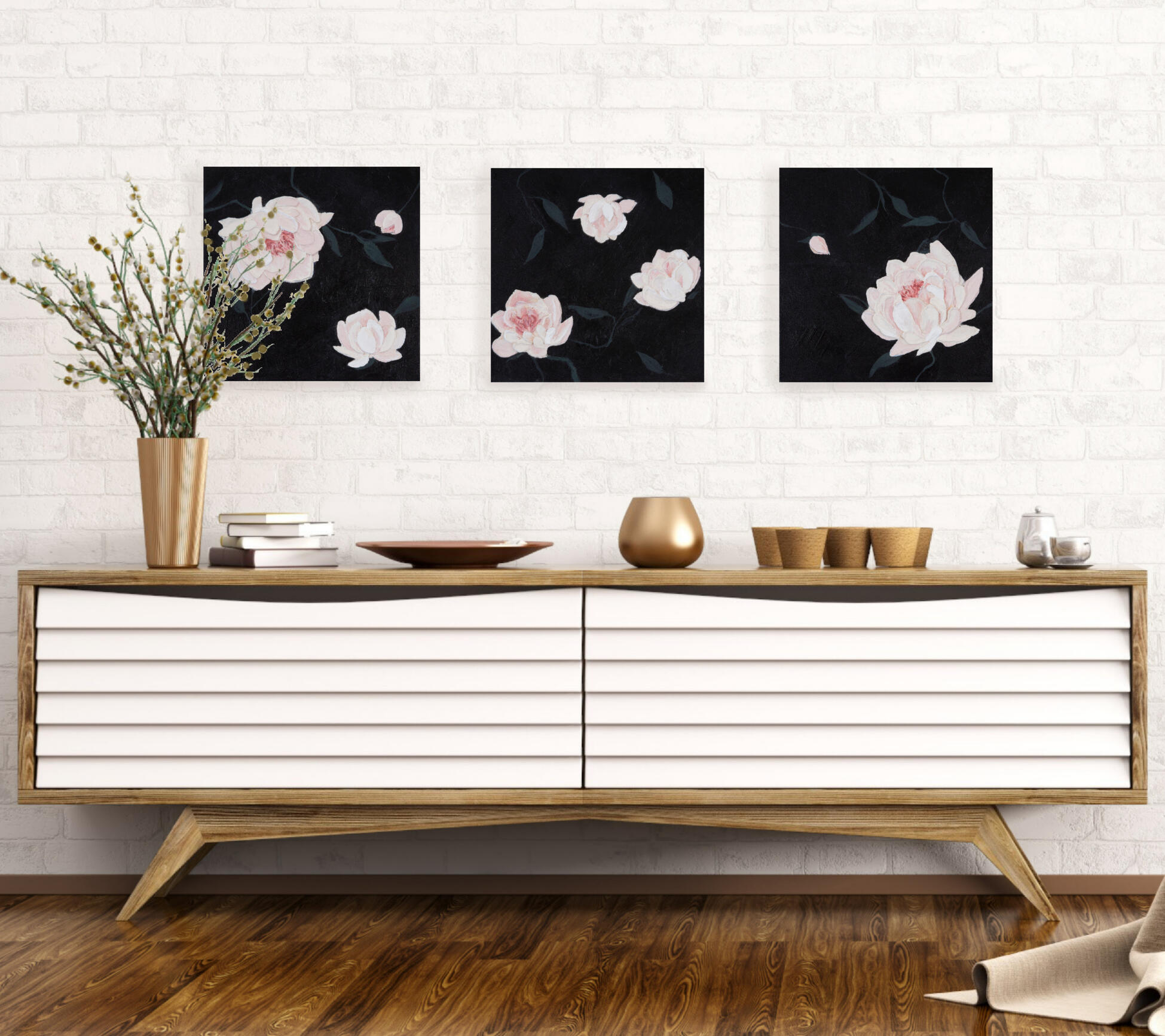 12 x 12ORIGINAL AVAILABLE$150 | $400 set"Peonies Noir" is a triptych constructed from bold contrasts, with the rich, velvety expanse of black serving as the backdrop against which the delicate, yet vibrant, pink peonies burst forth in sharp, textured relief.But what truly captivating about "Peony Noir" is its' unapologetic nature. This triptych celebrates the duality of femininity in all its forms, delicate and strong, understated but bold. It challenges the conventional belief that these are contradicting elements, exuding